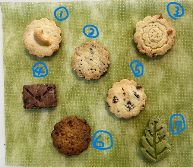 ①カシューナッツ ②ゴマ ③チーズ ④ショコラ ⑤レーズン